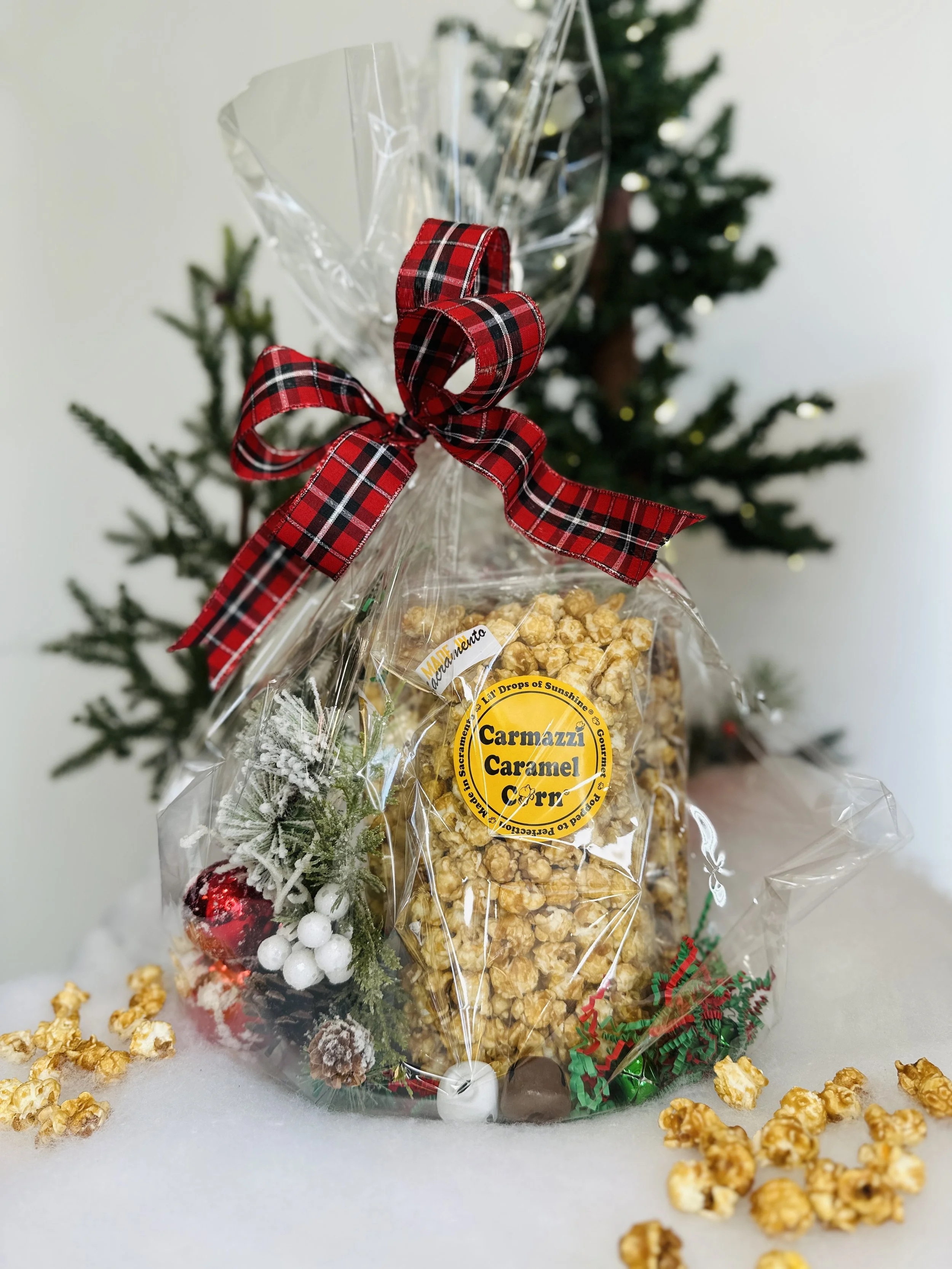 Three 8oz bags (1-Chocolate Drizzle, 1-Classic Caramel, 1-Cheesy Corn), Gift Wrapped, Holiday Ribbon & DecorationsPricing: $45